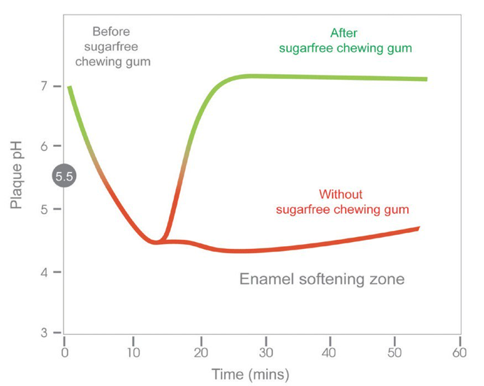 See the diagram below. It shows how your tooth enamel is at risk from acid attack after food and drink, and how long it takes the acid level in the mouth to return to the safe zone. pH is the measure of acidity, with levels below 5.5 being acid enough to soften tooth enamel. Chewing sugar-free gum after eating can quickly lower the amount of acid that attacks the teeth.